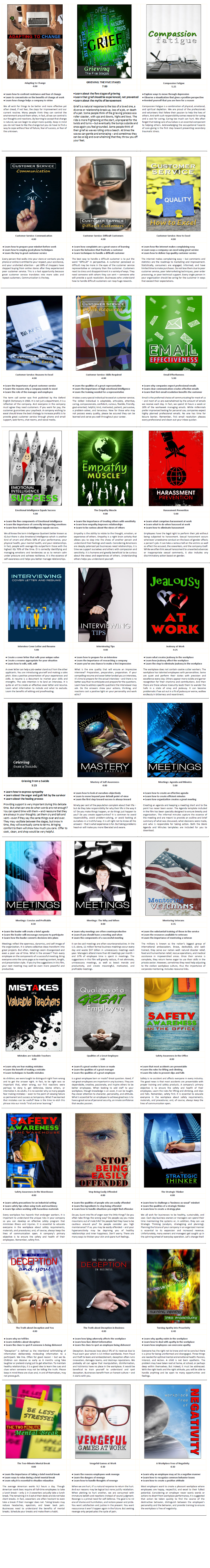 The Business Essential Series contains 33 powerful short HR training films (that includes a bonus film). From safety training to teamwork to meetings, this mega series will inspire your employees and managers to challenge their way of thinking and become more cooperative and productive. The secret is to incorporate short films on understanding emotions and expanding awareness. Once your staff can manage their emotions, they are completely open to absorbing additional policies and procedures as well as handle change at work.