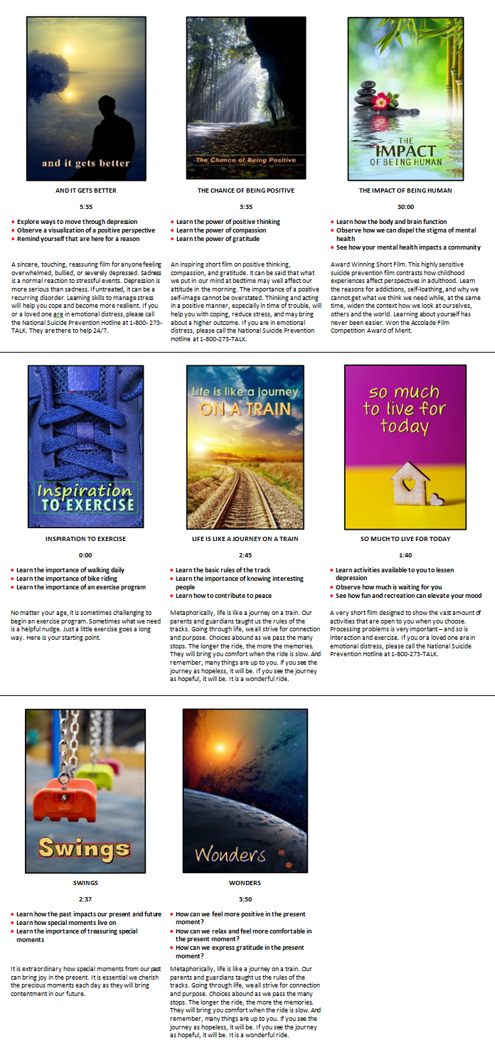 The Healthy Body and Mind series consists of eight films on depression, suicide prevention, and acceptance of self. Viewers will benefit from the encouraging messages, beautiful imagery, soothing narratives, and comforting music.