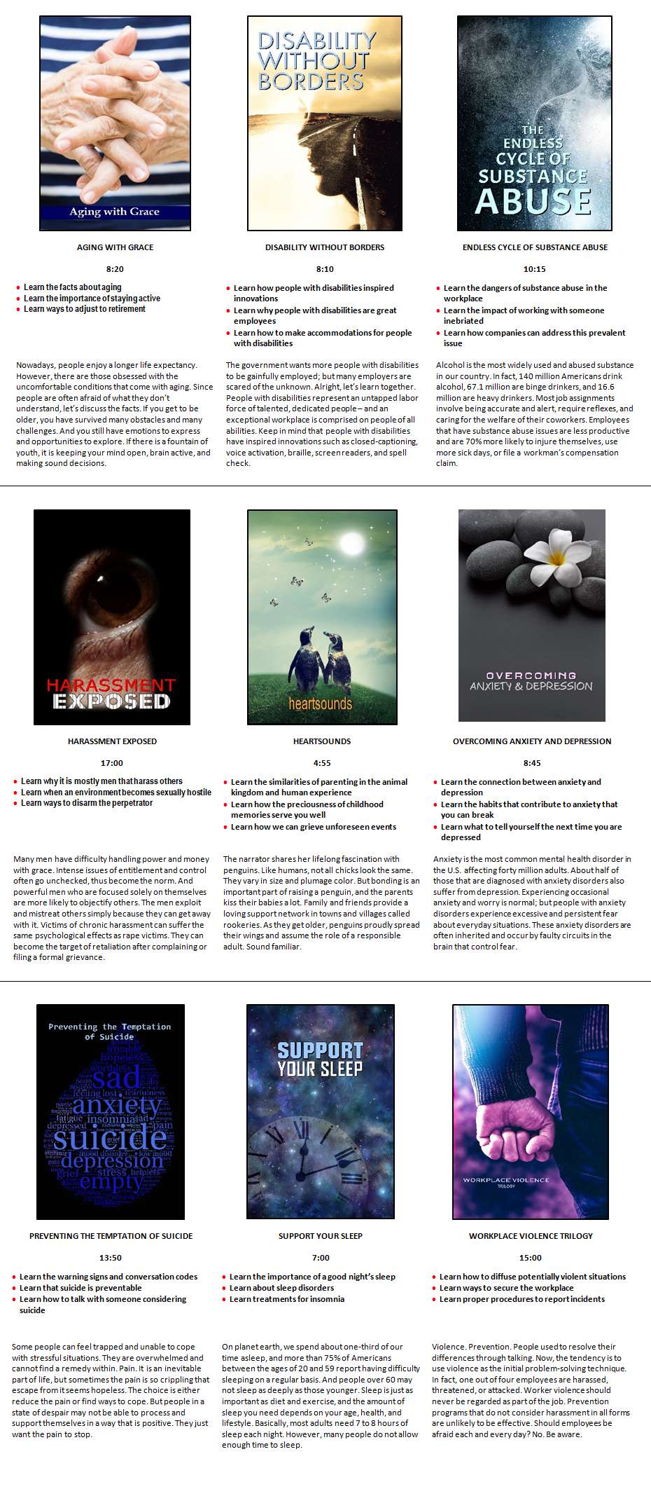 Stress is certainly prevalent in the workplace but employees are often afraid or ashamed to ask for help. Personal lives account for 20% of stress and discord. Considering we spend a substantial amount of time at work, a company has an opportunity to offer assistance to these employees who are hurting, misguided, or addicted; basically, good people with a problem. Films are ideal for Employee Assistance Programs.